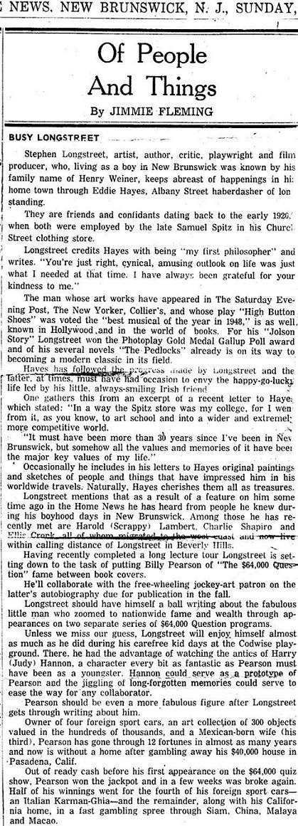 Eddie Hayes, a longtime friend from about 1930 to 2001. Life long friend of Henry Weiner (Stephen Longstreet) and haberdasher of long-standing on Albany St., in New Jersey. Our warm thanks to Grant Stiff, his nephew, for providing this news clipping.. |